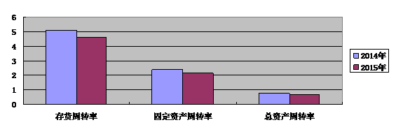 從資產(chǎn)狀況分析,2015年上市公司資產(chǎn)使用效率持續(xù)走低,存貨余額增加,存貨周轉(zhuǎn)率、固定資產(chǎn)周轉(zhuǎn)率、總資產(chǎn)周轉(zhuǎn)率均下滑(詳見圖1)。存貨余額為938.74億元,同比增長3.18%,存貨周轉(zhuǎn)天數(shù)為79.35,同比增加7.64;應(yīng)收賬款周轉(zhuǎn)天數(shù)為34.34,同比增加5.8。數(shù)據(jù)表明,上市公司總體產(chǎn)能過剩問題依然突出,企業(yè)產(chǎn)能利用率下降,去庫存壓力依然較大,個別公司以賒銷方式去庫存導(dǎo)致資金回籠放緩,資產(chǎn)質(zhì)量下降。