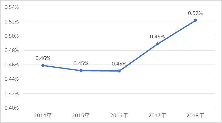 2018年,安徽上市公司累計(jì)總資產(chǎn)規(guī)模為12,649.57億元(見圖2-1),全省累計(jì)總資產(chǎn)占全國總資產(chǎn)比重達(dá)到0.52%(見圖2-2)。上市公司總資產(chǎn)規(guī)模增加的主要原因之一是淮北礦業(yè)(600985.SH)重組上市導(dǎo)致上市公司由原24.19億元的總資產(chǎn)規(guī)模躍至589.57億元。