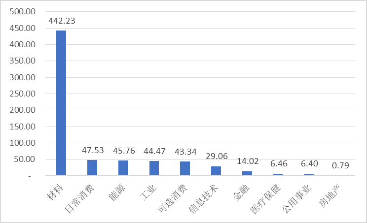 從行業(yè)劃分來看,安徽金融行業(yè)上市公司的平均總資產(chǎn)高達(dá)426.99億元,遠(yuǎn)超日常消費(fèi)、醫(yī)療保健等行業(yè)(見圖2-3)。行業(yè)內(nèi)累計(jì)總資產(chǎn)規(guī)模最大的為材料行業(yè)(4062.98億元),其次是工業(yè)行業(yè)(2520.47億元),排名第三是可選消費(fèi)行業(yè)(2127.32億元),總資產(chǎn)規(guī)模最小的是醫(yī)療保健行業(yè),僅有82.52億元。