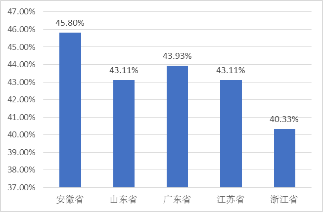 報(bào)告期內(nèi)安徽上市公司的凈資產(chǎn)收益率平均值為5.54%,高于全國的均值3.18%。但是相較于2016年(9.69%)、2017年(8.90%)的平均凈資產(chǎn)收益率而言,安徽2018年的平均凈資產(chǎn)收益率下降幅度約為37.75%(見圖2-18)。與其他四個省份相比,2018年安徽上市公司的平均凈資產(chǎn)收益率水平超過了廣東省、江蘇省與浙江省,僅比山東省低0.75個百分點(diǎn)(見圖2-19)。