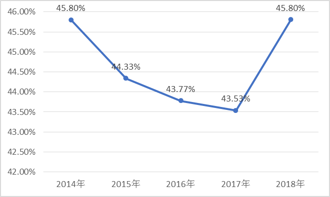 2018年度安徽上市公司平均資產(chǎn)負(fù)債率(平均負(fù)債/平均資產(chǎn))為45.80%(見圖2-21),高于其他省份同期數(shù)據(jù)。近五年來,2014年至2017年間,安徽上市公司的平均資產(chǎn)負(fù)債率呈逐年下降的趨勢(見圖2-22),2018年則顯著上升,回歸至2014年的資產(chǎn)負(fù)債率水平(見圖2-23)。