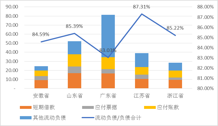 2018年安徽上市公司“流動負(fù)債/負(fù)債合計(jì)”指標(biāo)為84.59%(見圖2-23)。2018年度安徽上市公司的短期借款在流動負(fù)債中占比最大,約為36.61%;其次為應(yīng)付賬款和應(yīng)付票據(jù),分別為26.72%、12.34%。與之相比,浙江省、山東省與安徽情況相似,流動負(fù)債中均是短期借款占比最大;而在廣東與江蘇省中者占比最大的是其他流動負(fù)債(分別為57.48%和39.26%),但短期借款仍是第二大占比的科目(分別為20.39%和27.19%)。