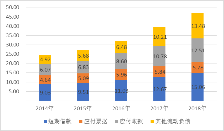 2014年至2018年,安徽上市公司的流動負(fù)債總額呈逐年上升的趨勢(見圖2-24),流動負(fù)債金額從2014年的24.66億元,增加至2018年達(dá)到46.83億元;從構(gòu)成上看,近年來短期借款的占比始終保持最高;應(yīng)付票據(jù)占比逐年下降,其他流動負(fù)債比重則逐年提升。