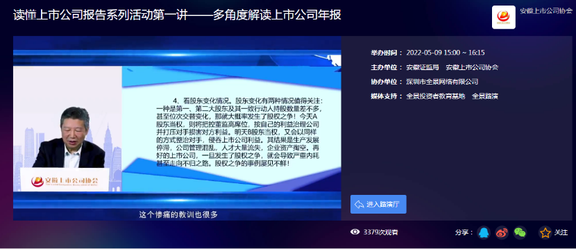為落實(shí)中國證監(jiān)會(huì)2022年“5·15全國投資者保護(hù)宣傳日”活動(dòng)要求,提高投資者的理性投資意識,我會(huì)2022年5月9日舉辦“讀懂上市公司年報(bào)”專題講座。講座由安徽合力獨(dú)董、原東華科技董秘羅守生主講,點(diǎn)擊量達(dá)5.3萬余次。
